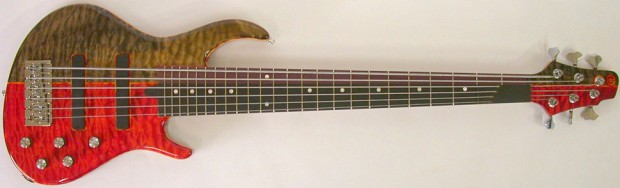 The Hellbass is built with a through neck of laminated maple and purple heart with swamp ash wings. The top is quilted maple with red and black high gloss finishes. Its fingerboard distinguishes the bass’s personalities with purple heart under the low E and A strings and ebony under the standard E, A, D, and G strings. Other features include a pair of Bartolini single coil pickups, a Glockenklang onboard preamp, a Hipshot bridge, Gotoh tuners, and Schaller straplocks.