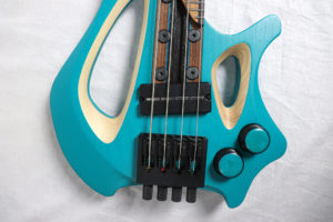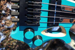 Wilson crafted the headless bass with a neck of walnut and wenge with blue birch accents. Its sapwood ziricote fingerboard has that enormous range with 30 stainless steel frets on the G-string. Even the blue glow inlay fret markers evoke a sense of sci-fi while complementing the turquoise finish.
