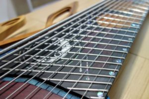 The eleven-string bass has a mahogany neck with a flamed maple top. The bass is tuned in perfect fourths – C#, F#, B, E, A, D, G, C, F, Bb, Eb – with its low C# string having a .266 gauge, which Okawa says can theoretically can produce a very low note of about 17 Hz. Its nine-piece neck is made from nyatoh, walnut, maple, and purpleheart. The neck also has a multi-scale design with an incredible range from 36.5 inches to 25.5 inches, while its ebonol fingerboard has a compound radius of 21.5 inches to 24 inches.